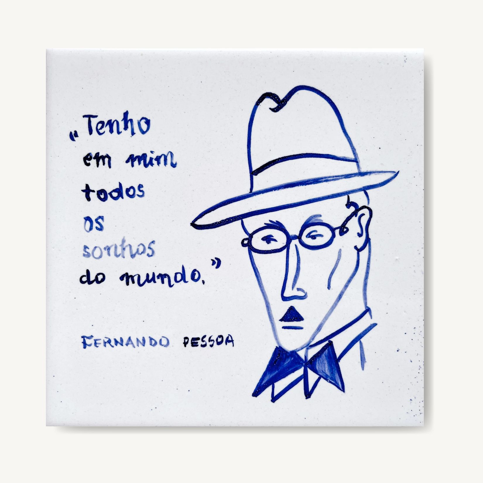 Kafelek kupisz solo ale możesz dokupić do niego ramkę drewnianą (do zawieszenia na ścianie) albo korkową – gdybyś chciała by Pessoa towarzyszył ci podczas leniwych popołudni z herbatą i książką.