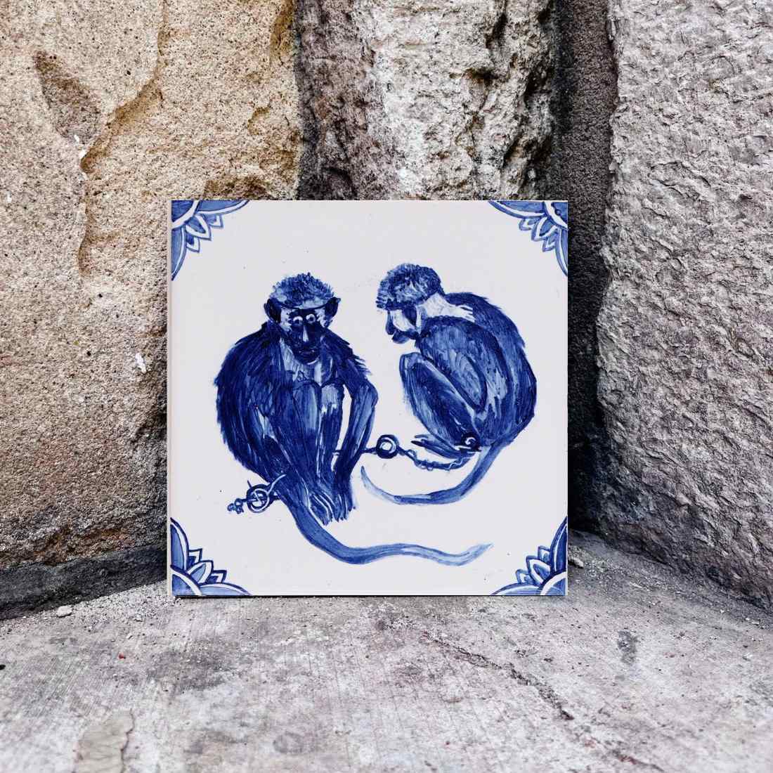Poruszona pięknem lizbońskiego Pałacu Fronteira namalowałam 6 kafelków nawiązujących do dekoracji  azulejos jakie widziałam w tamtejszym ogrodzie. Były wśród nich małpki oddające się ludzkim zajęciom (łowieniu ryb, jazdą karetą itd.). Mi od razu przypomniał się obraz Breughla, który widziałam w Berlinie rok wcześniej. Mój zachwyt był jeszcze większy jak okazało się, że Szymborska napisała o nich wiersz. Oczywiście – swoim zwyczajem – zmieniłam ich kolor na kobaltowy. Uważam, że w kobalcie wszystko wygląda lepiej 😉