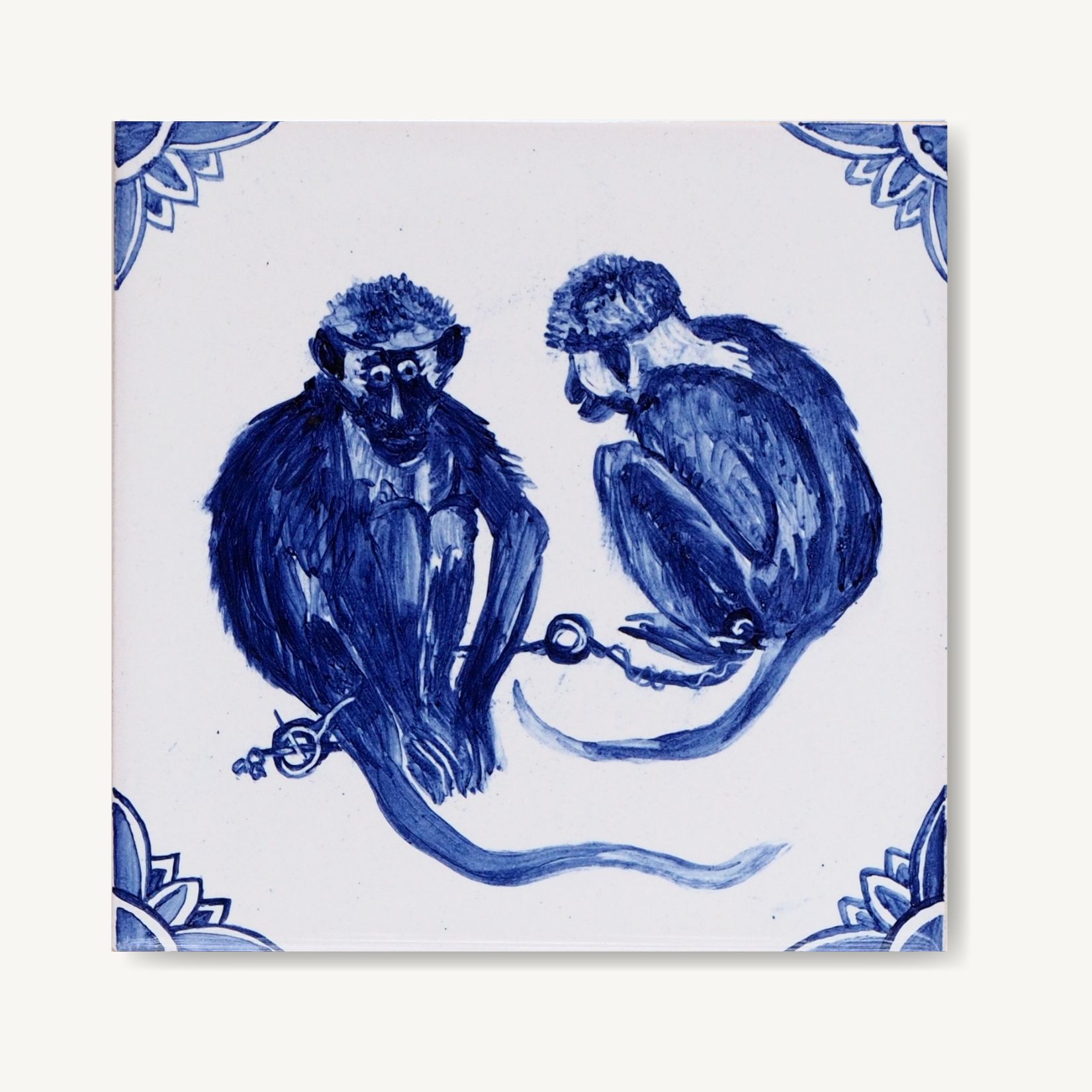 Poruszona pięknem lizbońskiego Pałacu Fronteira namalowałam 6 kafelków nawiązujących do dekoracji azulejos jakie widziałam w tamtejszym ogrodzie. Były wśród nich małpki oddające się ludzkim zajęciom (łowieniu ryb, jazdą karetą itd.). Mi od razu przypomniał się obraz Breughla, który widziałam w Berlinie rok wcześniej. Mój zachwyt był jeszcze większy jak okazało się, że Szymborska napisała o nich wiersz. Oczywiście – swoim zwyczajem – zmieniłam ich kolor na kobaltowy. Uważam, że w kobalcie wszystko wygląda lepiej 😉