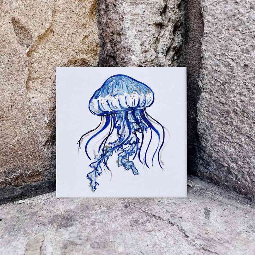 Kafelek z meduzą chętnie potowarzyszy ci w domu i na stole, w biurze i na biurku. Odporny jest na wysokie temperatury – nie straszne mu ani patelnie z jajecznicą ani kubki herbaty. A co tam – lampkę wina też na nim postaw! Albo nastrojową świeczkę – skapujący wosk łatwo z niego zsuniesz.