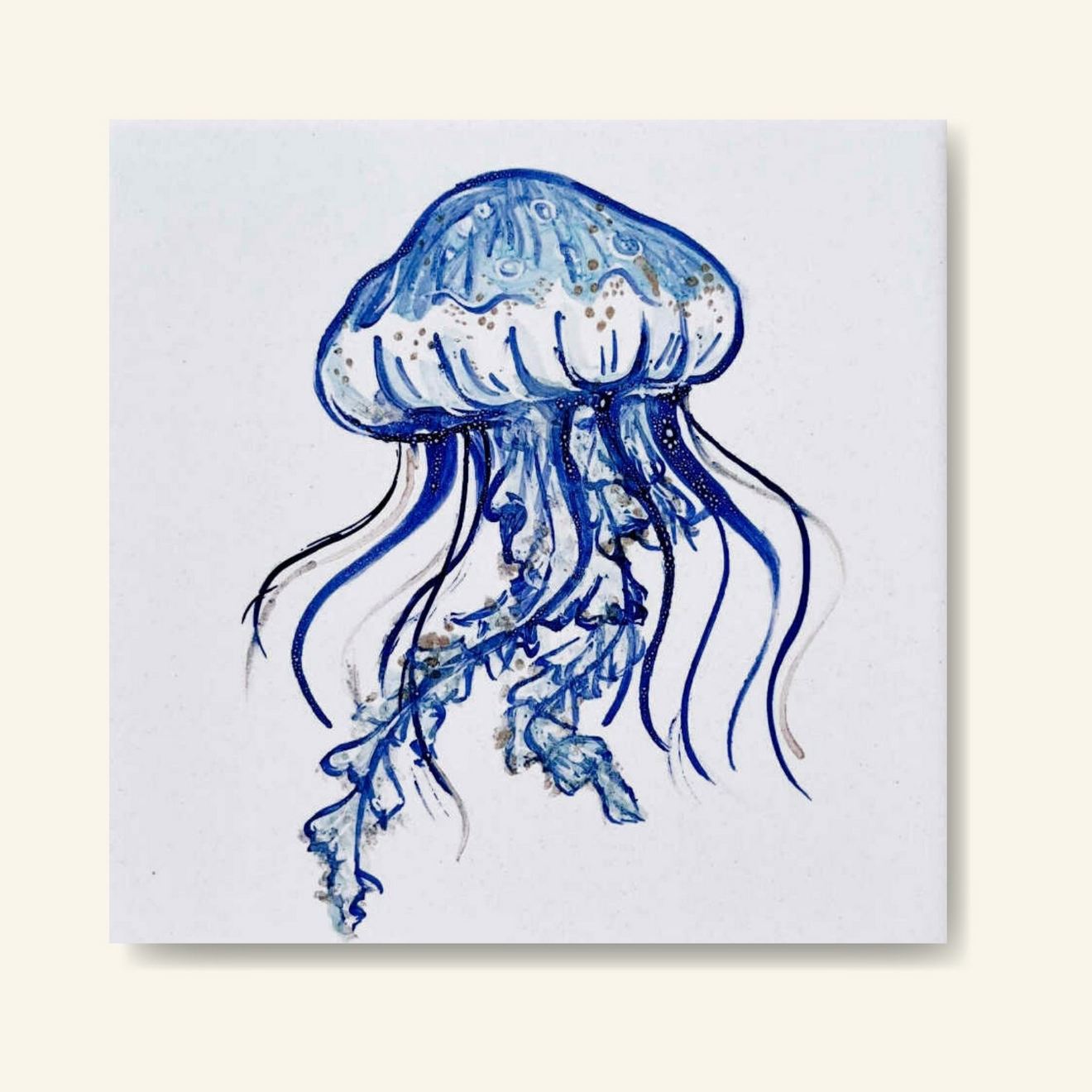 Do kafelka z meduzą idealnie pasuje ramka korkowa lub drewniana (obie dostępne są w moim sklepie) – kafelek i ramka są dla siebie wręcz stworzeni!