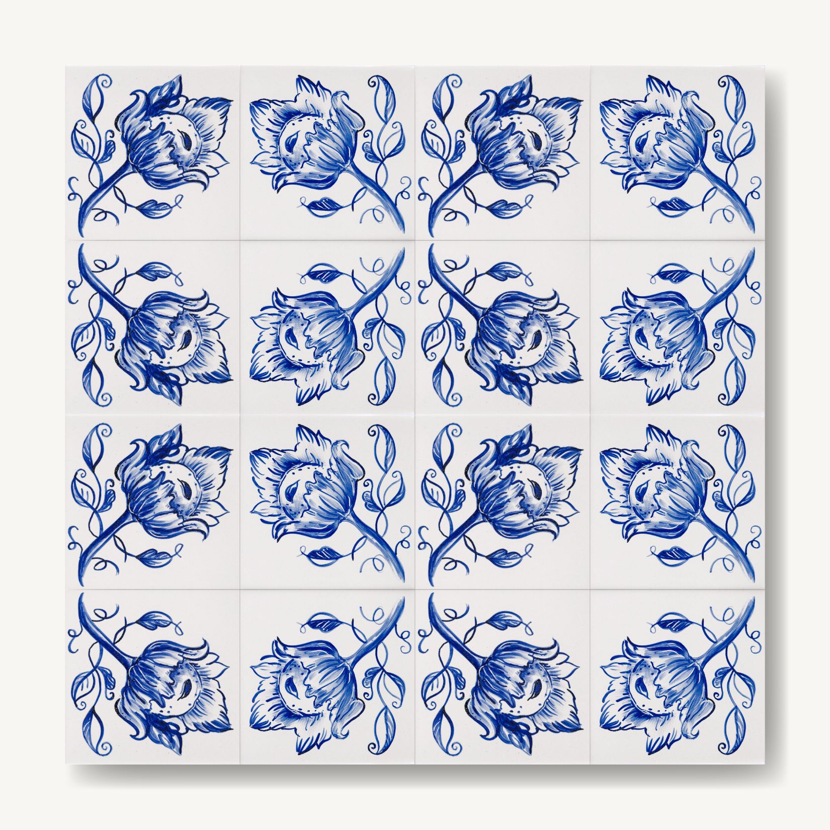 Każdy kafelek malowany jest ręcznie techniką majoliki. Dlatego drobne różnice w kresce czy odcieniu są naturalną częścią ich charakteru. Kiedy układają się obok siebie, tworzą żywy rytm – delikatnie zmienny, ale spójny.