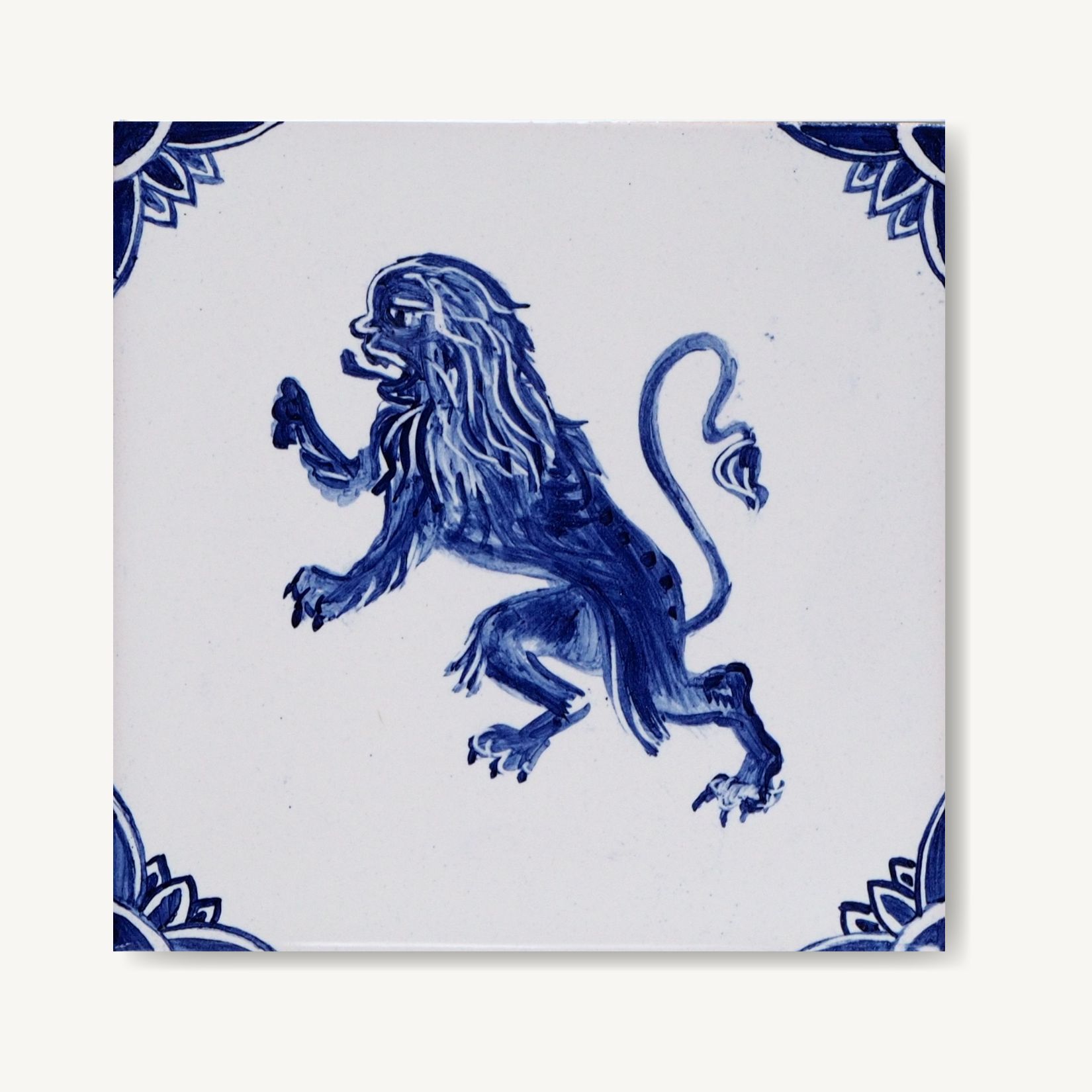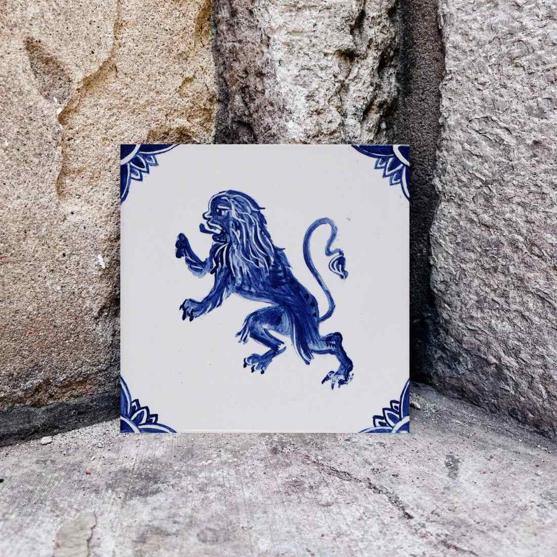 Poruszona pięknem lizbońskiego Pałacu Fronteira namalowałam 6 kafelków nawiązujących do dekoracji azulejos jakie widziałam w tamtejszym ogrodzie. Lew jest jednym z nich. Na pałacowej ścianie jest zielony, ale ja lubię wszystko przekładać na kobalt (uważam, że w kobalcie wszystko wygląda lepiej 😉), a Skazą stał się z… przewrotności. I z powodu mojej sympatii dla podcastów true crime (z którymi jego zbieżność jest zupełnie przypadkowa).