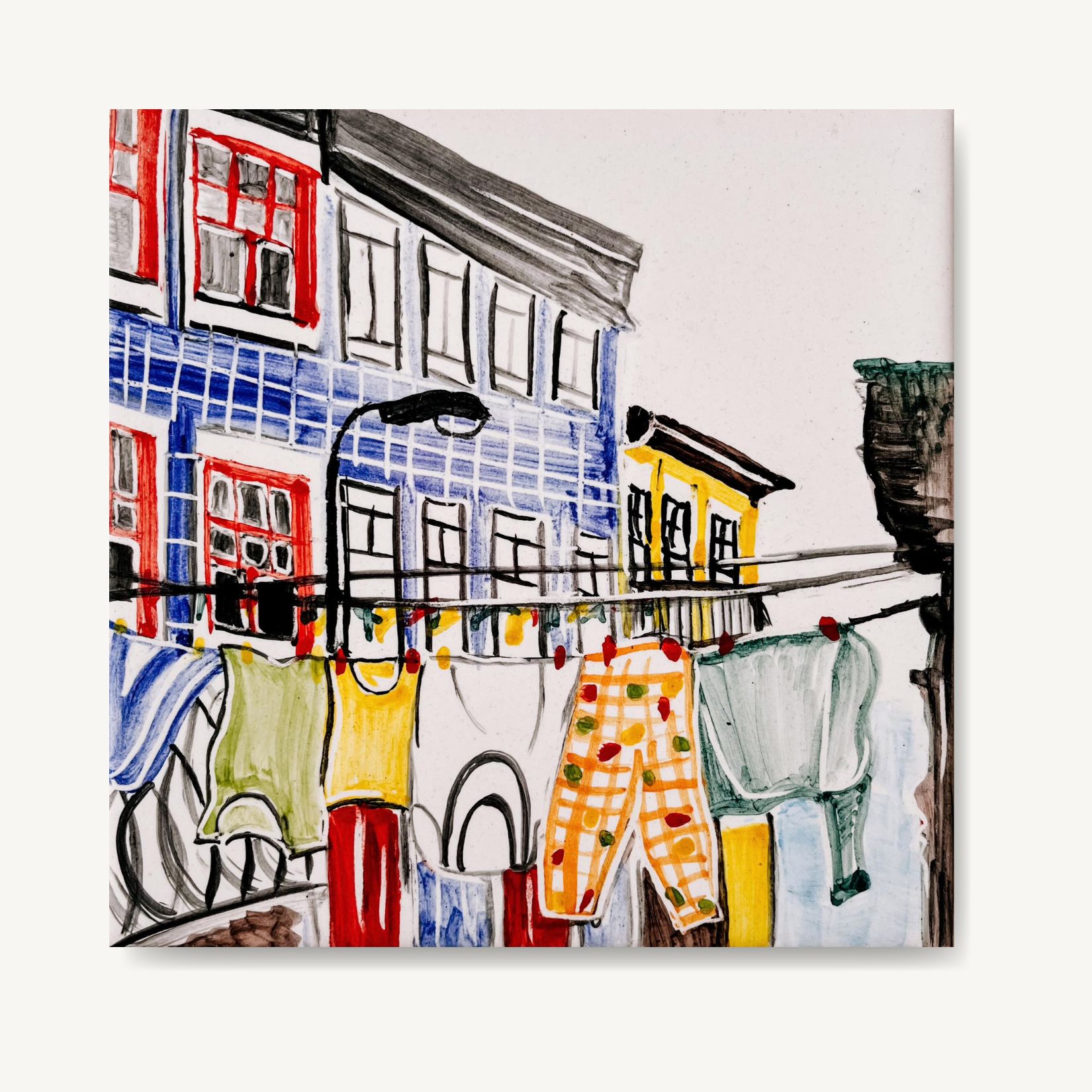 W listopadowy dzień, kiedy już dawno zniknie opalenizna z twoich ramion, kafelek ze sznurem prania przypomni ci o wakacjach. I wprawi w dobry humor. Uśmiechniesz się na wspomnienie spaceru wśród kolorowych koszulek 🙂