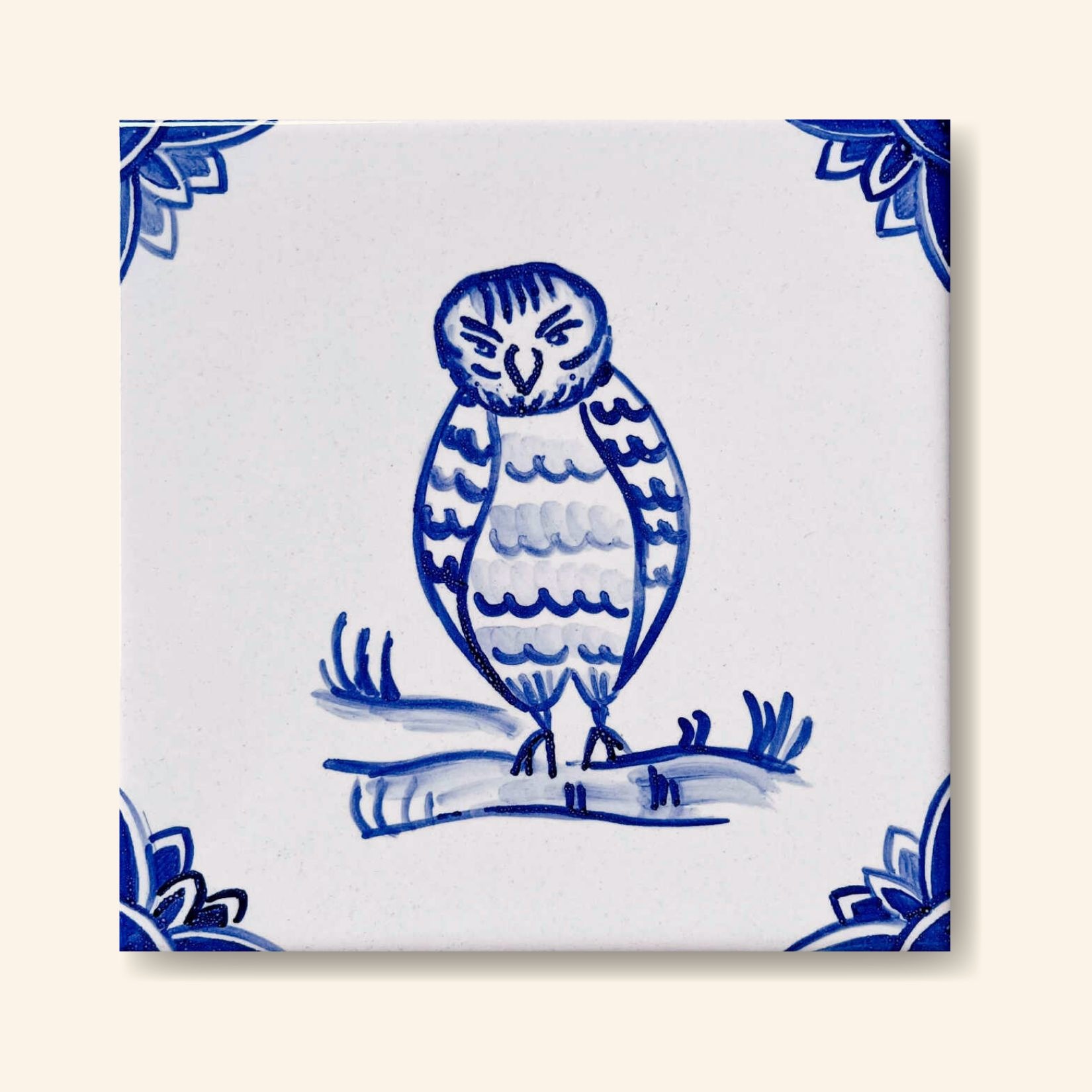Ten kafelek z motywem sowy jest jedną z ilustracji w kolekcji mix & match inspirowanej holenderską tradycją. Uproszczony rysunek, spokojna linia i ograniczona paleta sprawiają, że dobrze funkcjonuje sam – jak mały obraz zamknięty w kwadracie.